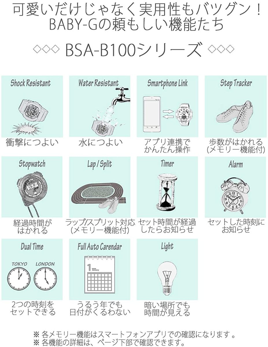 女性らしいデザインとアクティブな機能を兼ね揃えたデザインのモデルの登場です●耐衝撃構造●10気圧防水機能●モバイルリンク機能(対応携帯電話とのBluetoothⓇ通信による機能連動)●針退避機能(針が液晶表示と重なって見づらいときは、針を液晶表示の上から一時的に退避させることができます)●歩数計測機能・歩数表示範囲:0~999,999歩・ 目標達成率表示(GOALマーク表示付き、目標歩数設定範囲:1,000~50,000歩、1,000歩単位)・ ステップリマインダー機能(一定時間の間に歩行が少ないと表示と電子音でお知らせ、ON/OFF 切替付き)・歩数グラフ(1時間毎の歩数を11時間分6段階でレベル表示)・ステップインジケーター表示・ パワーセービング機能(一定時間動きが無いと自動的にセンサーをスリープ状態にし節電)●デュアルタイム(ホームタイムとの時刻入替機能付き)●ストップウオッチ(1/100秒(1時間未満)/1秒(1時間以上)、24時間計、ラップ/スプリット付き、 計測データを最大200本メモリー(計測月・日、ラップ/スプリットタイム)、ターゲットタイム報知機能付き、ターゲット報知(目標タイム)を10本までセット可能(セット単位:1秒、最大セット23時間59分59秒))●タイマー:最大5つの時間設定が可能なインターバル計測用のタイマー(セット単位:1秒、最大セット:60分、1秒単位で計測、オートリピート、オートスタート)●時刻アラーム5本・時報●フルオートカレンダー●12/24時間制表示切替●操作音ON/OFF 切替機能●ダブルLEDライト:文字板用LEDライト(オートライト、スーパーイルミネーター、残照機能、残照時間切替(1.5秒/3秒)付き)、LCD 部用LEDバックライト(オートライト、スーパーイルミネーター、残照機能、残照時間切替(1.5秒/ 3秒)付き)※ スマートフォンと連携しない場合は通常のクオーツ精度(平均月差±15秒)で動作します。